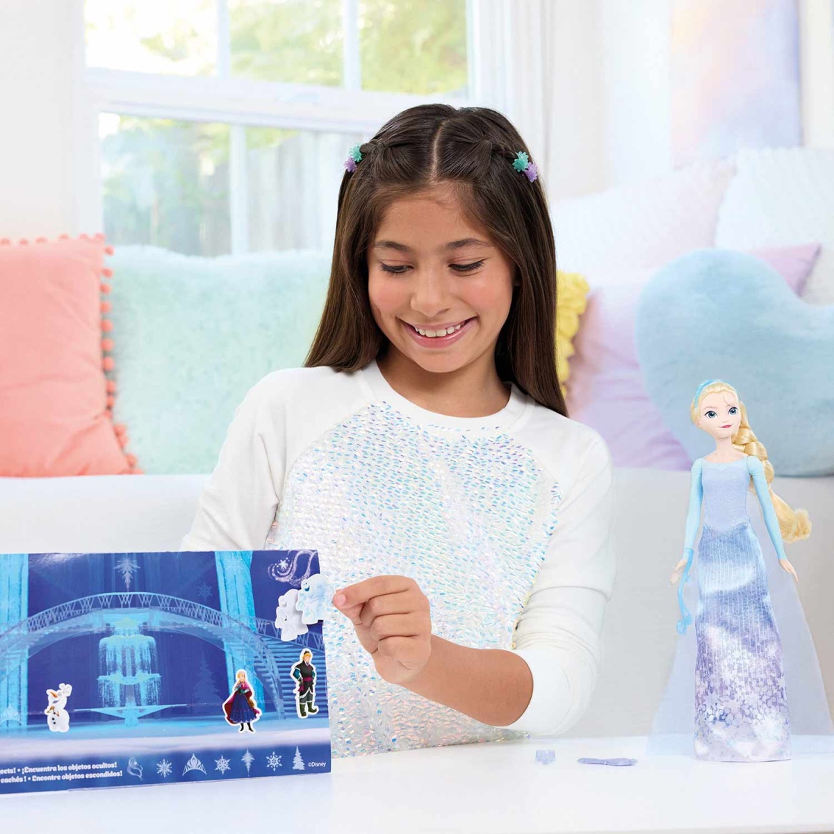 As crianças podem decorar o cenário com autocolantes e completar a atividade divertida: encontrar objetos escondidos no palácio de gelo da Elsa!