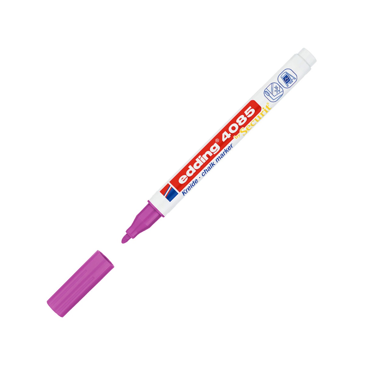 Liquid chalk marker for decorating and writing non-permanently, for example, on windows, slate boards, glass, Plexiglas® and mirrors. The bullet tip has a line width of 1-2 mm. The water-based, covering, and odorless liquid chalk can be erased with a damp cloth on almost all non-porous surfaces.