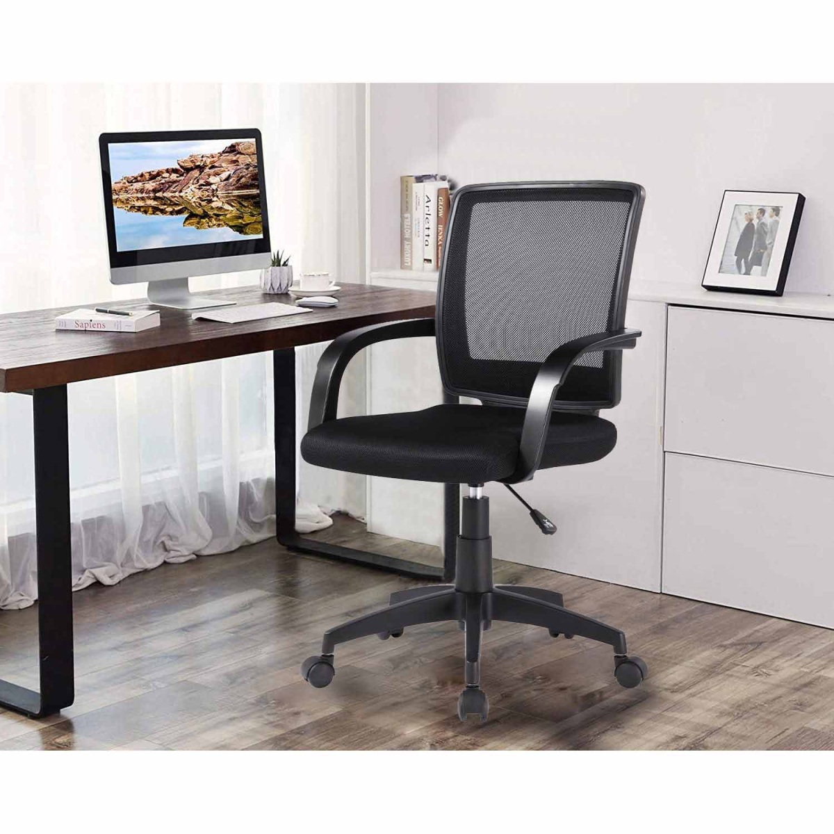 This 360° swivel chair combines functional design with high-quality materials, offering a comfortable and durable seating experience. The nylon mesh backrest ensures ventilation and support, while the mesh fabric-covered seat provides additional comfort even during long periods of use.