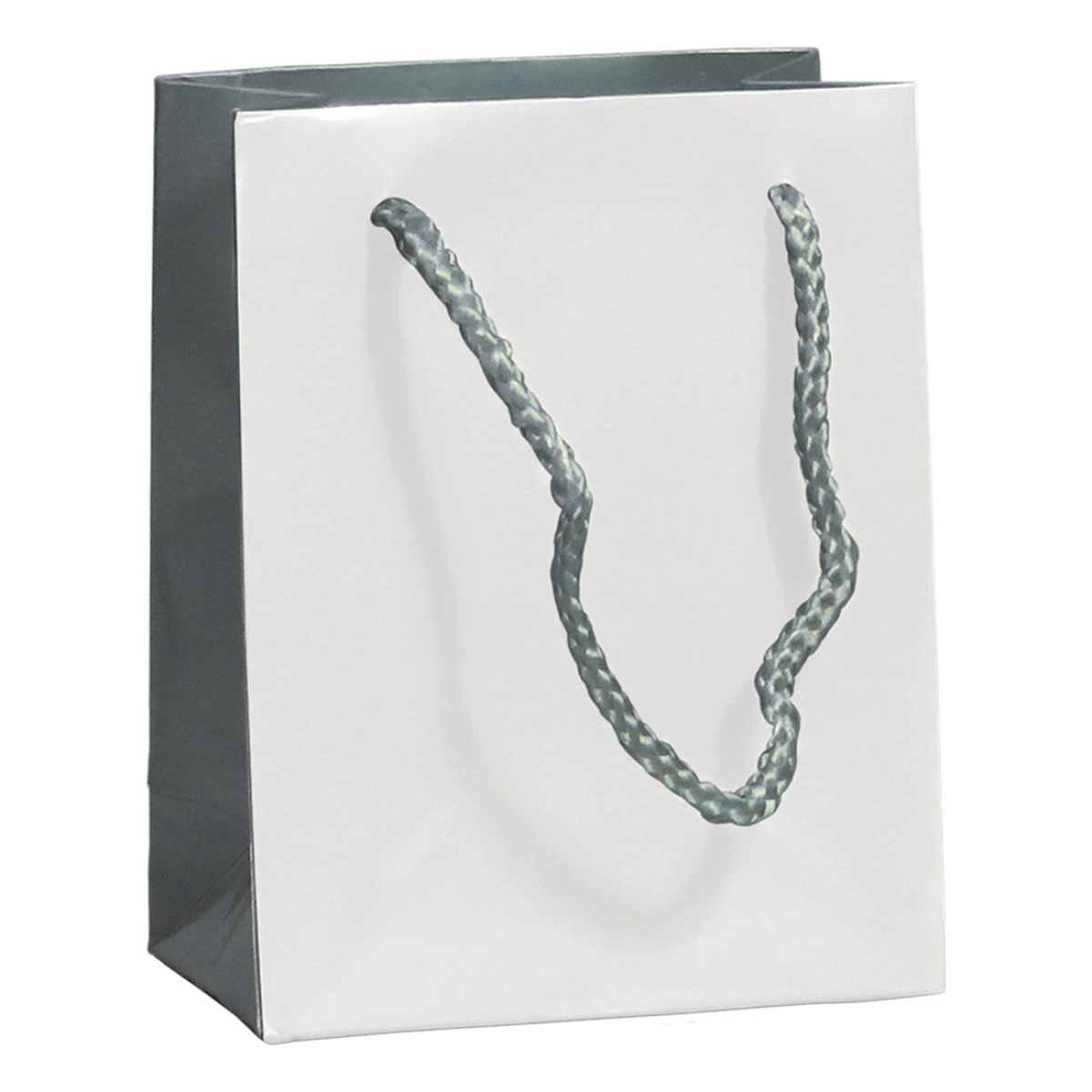 Luxury paper bag with drawstring handle, 210g, white/silver, 11.5x6x14.5cm