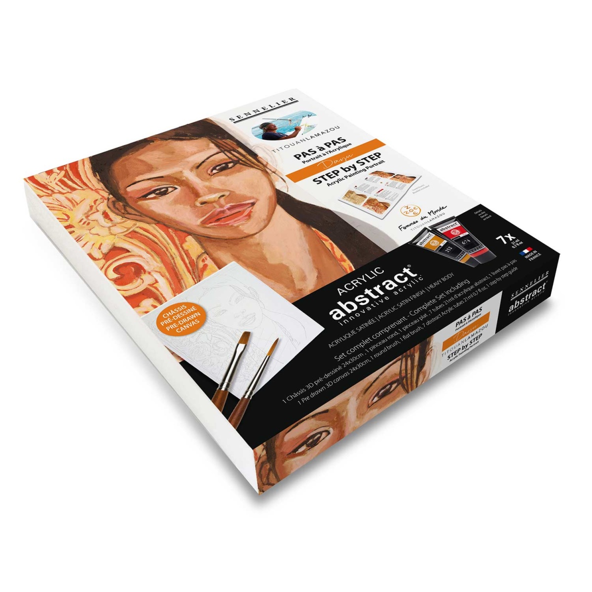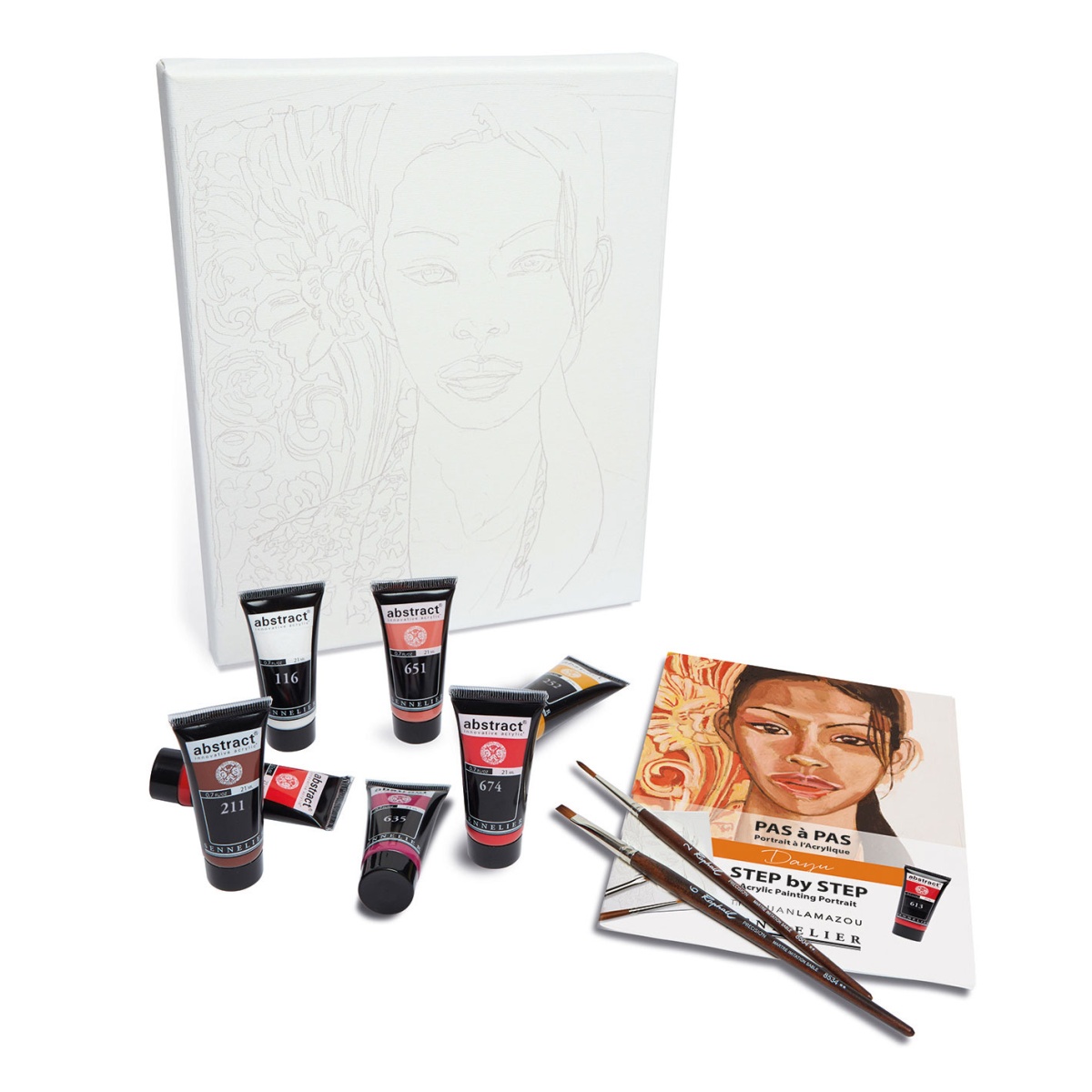 Los kits de pintura acrílica paso a paso Sennelier Abstract, desarrollados en colaboración con el artista Titouan Lamazou, ofrecen una experiencia pictórica completa, inmersiva y accesible. Estos kits incluyen todos los materiales necesarios para crear la obra, con pinturas acrílicas Abstract conocidas por su textura cremosa y alta pigmentación, ideales tanto para grandes superficies como para detalles precisos. Hay cuatro kits disponibles con retratos distintos: Dayu, Blessing, Gwendoline y Kabari. Todos los kits contienen un marco prediseñado de 24 x 30 cm, siete tubos de 21 ml de pintura acrílica, un pincel redondo, un pincel plano y un folleto con instrucciones detalladas paso a paso.