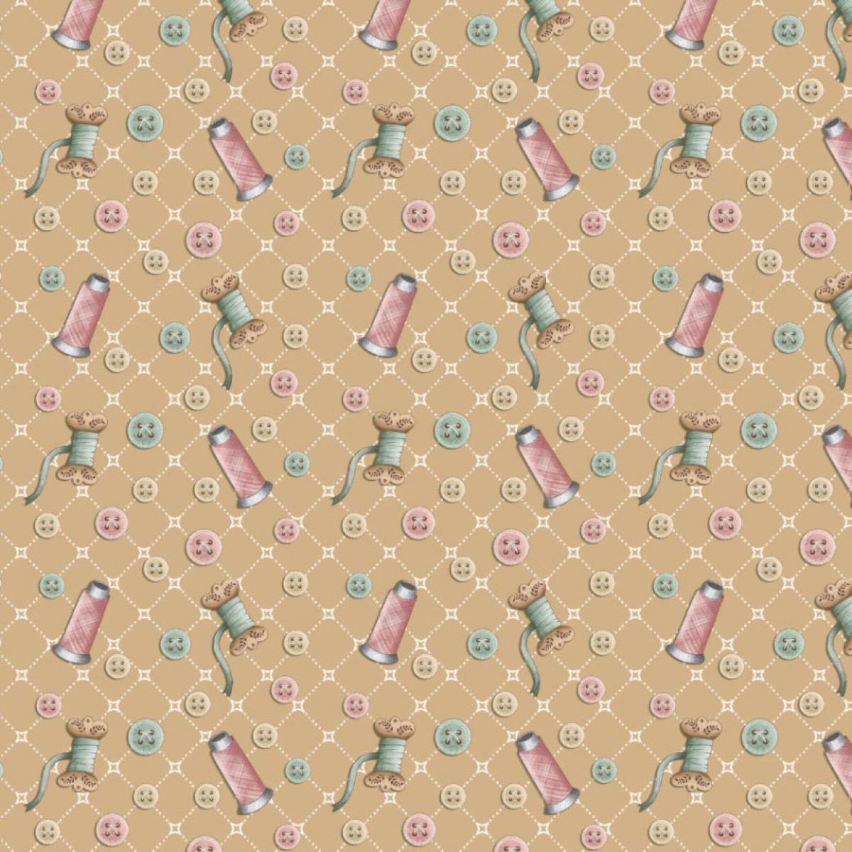 Tecido FUXICOS E FRICOTES Unindo Pedacinhos botões e carretéis caramelo 1x1,50m