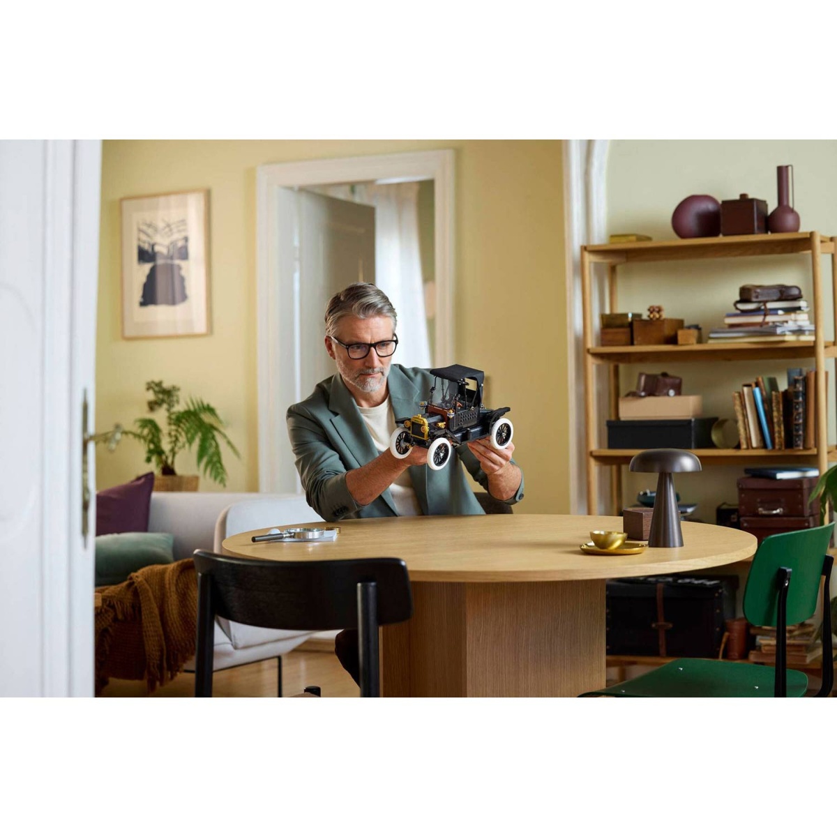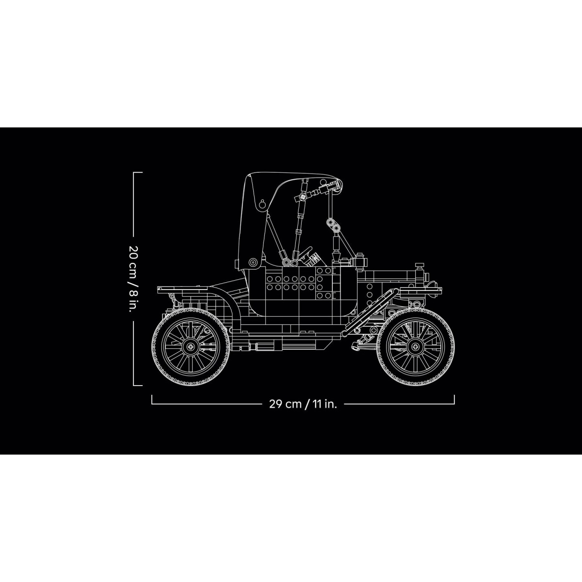 Celebra un icono de la historia del automóvil con el kit de construcción LEGO® Icons Ford Modelo T (11376) para adultos. Esta réplica auténtica del coche de 1910 cuenta con un techo de tela abatible, un parabrisas abatible con divisor y una puerta de pasajeros. Otras características incluyen un maletero que se abre y una cabina del conductor muy detallada con un volante funcional. Levanta el asiento para acceder al depósito de combustible. Levanta los paneles del capó a ambos lados para admirar el motor y gira la manivela para hacer girar el ventilador. Con carrocería negra, detalles dorados y grandes ruedas blancas de radios, este modelo de coche clásico es una pieza elegante para exhibir en casa o en la oficina. Este modelo premium es una excelente idea de regalo para los aficionados a los coches clásicos americanos. Descubre la inspiradora gama de proyectos creativos LEGO (se venden por separado), diseñados específicamente para adultos. Construye de forma más inteligente con la aplicación LEGO Builder: haz zoom, gira en 3D, sigue el progreso y sigue las instrucciones digitales paso a paso. El set contiene 1060 piezas.