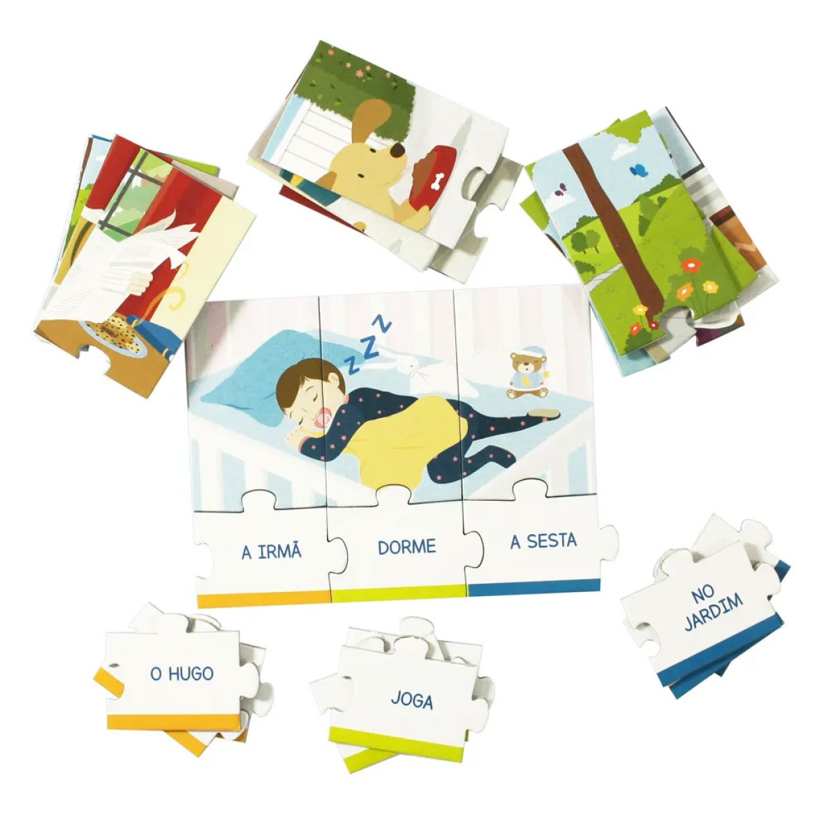 Primero, los niños aprenden a hablar y poco a poco adquieren más y más palabras. Luego, se entusiasman tanto con su nueva habilidad que quieren decirlo todo a todo el mundo, pero, pobrecitos, siempre se les mezclan las palabras y es un desastre. Al fin y al cabo, todo es muy nuevo y aprender es un proceso. ¿Por qué no darles un poco de ayuda? Con el juego educativo Preescolar – Las Primeras Oraciones, los niños practicarán las reglas de la construcción de oraciones para que en el futuro puedan expresarse sin dificultad. Mediante pequeños rompecabezas, el niño armará varias oraciones que le permitirán comprender e interiorizar, de forma lúdica, la regla gramatical principal: primero el Sujeto, luego el Verbo y finalmente el Predicado. Pero, como sabemos que esta información aún es muy nueva y difícil para los más pequeños, hemos incorporado pequeñas ayudas en las piezas. Cada uno de estos elementos de la oración está representado por un color: el Sujeto es naranja, el Verbo es verde y el Predicado es azul. Esto facilita que el niño identifique dónde debe ir cada pieza en el rompecabezas. Además, las frases van acompañadas de imágenes que muestran al niño la escena que debe describir con palabras. Sin embargo, también puede crear sus propias frases. Comienza tu viaje al idioma portugués ahora con Preescolar: Las Primeras Frases. Si te interesa adquirir más conocimientos de forma divertida, te recomendamos explorar el resto de nuestra gama Preescolar: Aprende Estudios Ambientales, Aprende Inglés, Aprende Matemáticas y Las Primeras Palabras.