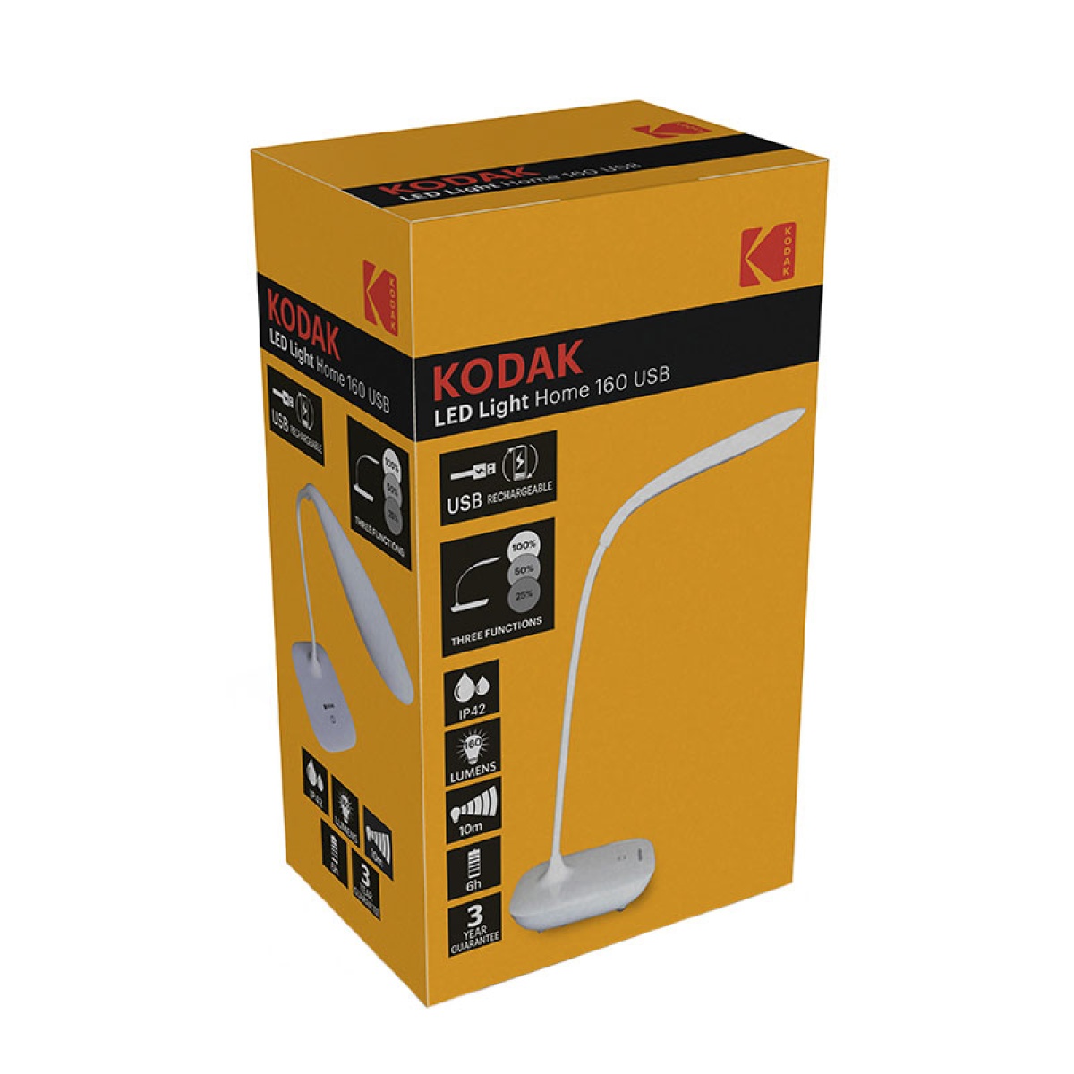 La KODAK LED Home 160 es una lámpara de escritorio elegante y bien diseñada que ofrece 160 lúmenes con un impresionante alcance de 10 metros. Totalmente ajustable, permite dirigir la luz según sus necesidades. Es recargable por USB y viene con una garantía de 3 años.