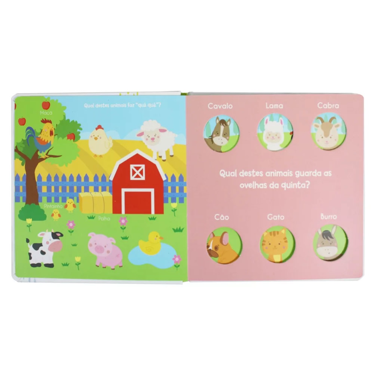 Dentro do livro, vais encontrar ilustrações fofas, feitas especialmente para crianças pequenas que estão a aprender as suas primeiras palavras. Cada página mostra diferentes animais e traz perguntas divertidas para tu responderes. Será que sabes “qual dos animais guarda as ovelhas na quinta?”