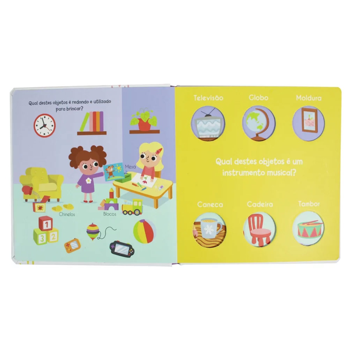 Dentro do livro, vais encontrar ilustrações fofas, feitas especialmente para crianças pequenas que estão a aprender as suas primeiras palavras. Cada página mostra diferentes objetos e traz perguntas divertidas para tu responderes. Será que sabes “qual dos objetos é um instrumento musical?”