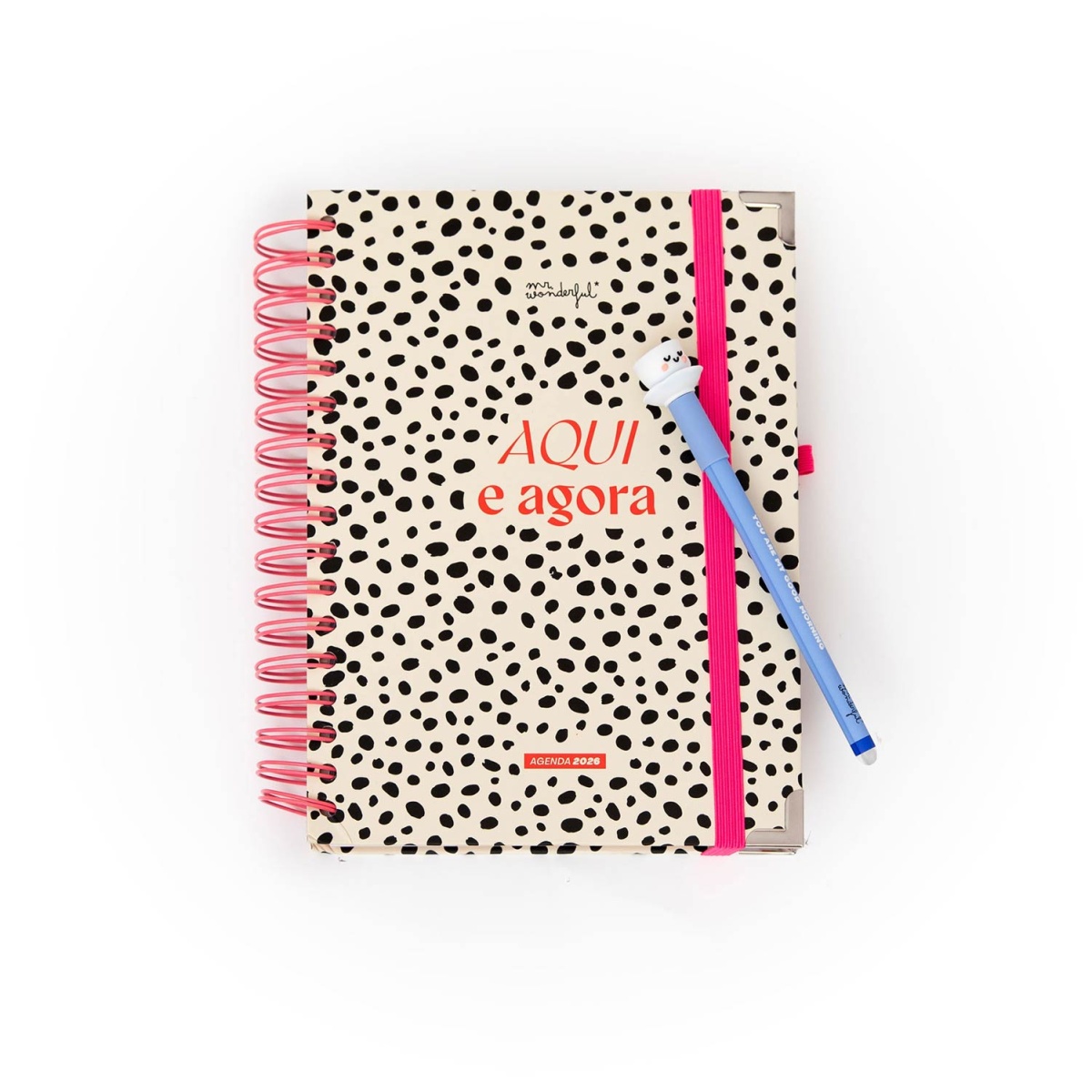 Agenda diária Office 170x226mm 2026 espiral MR.WONDERFUL "Aqui e agora" + esferográfica apagável