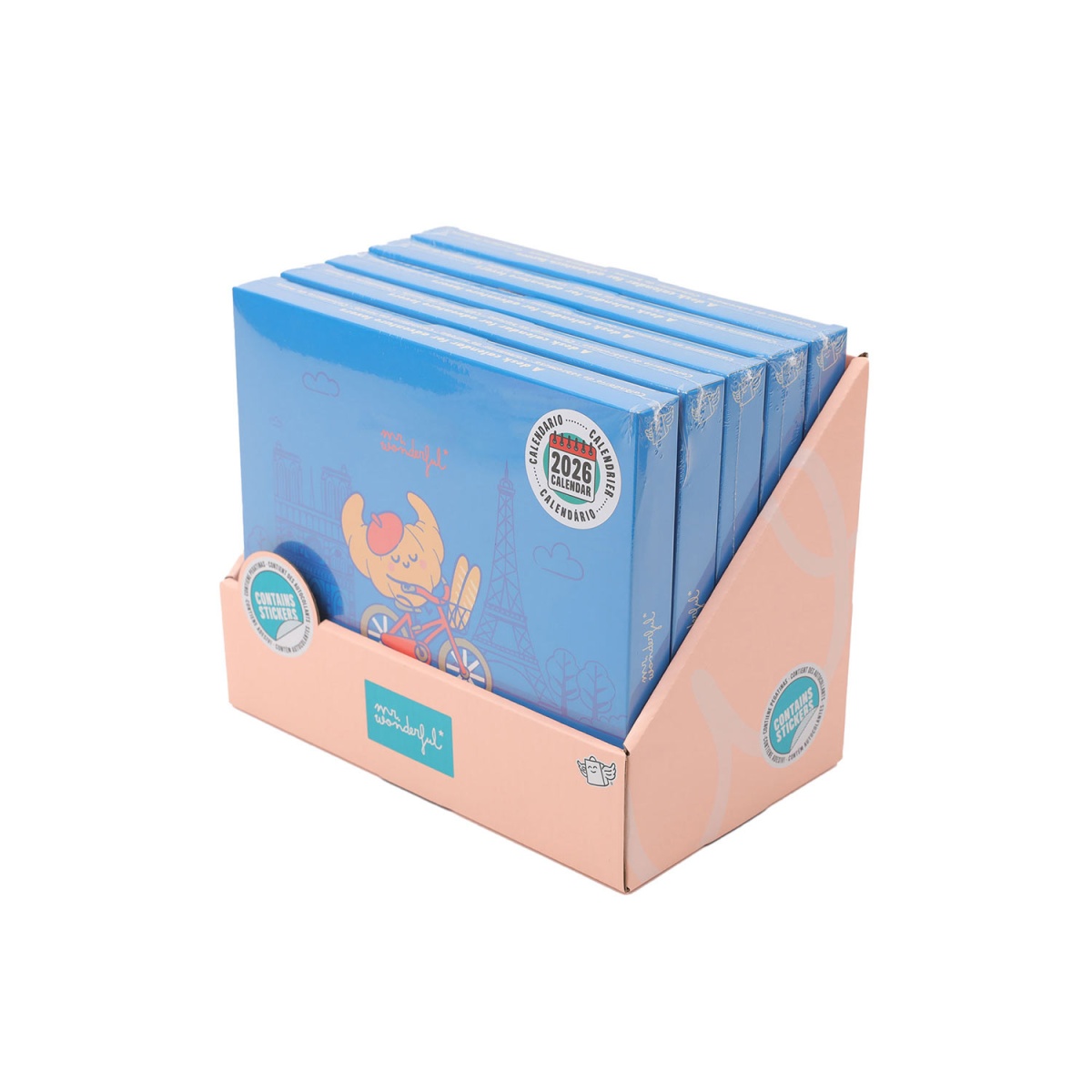 Neste calendário de secretária 2026 da Mr. Wonderful encontrarás as divertidas personagens Bo-Bo a percorrer alguns dos lugares mais turísticos do planeta